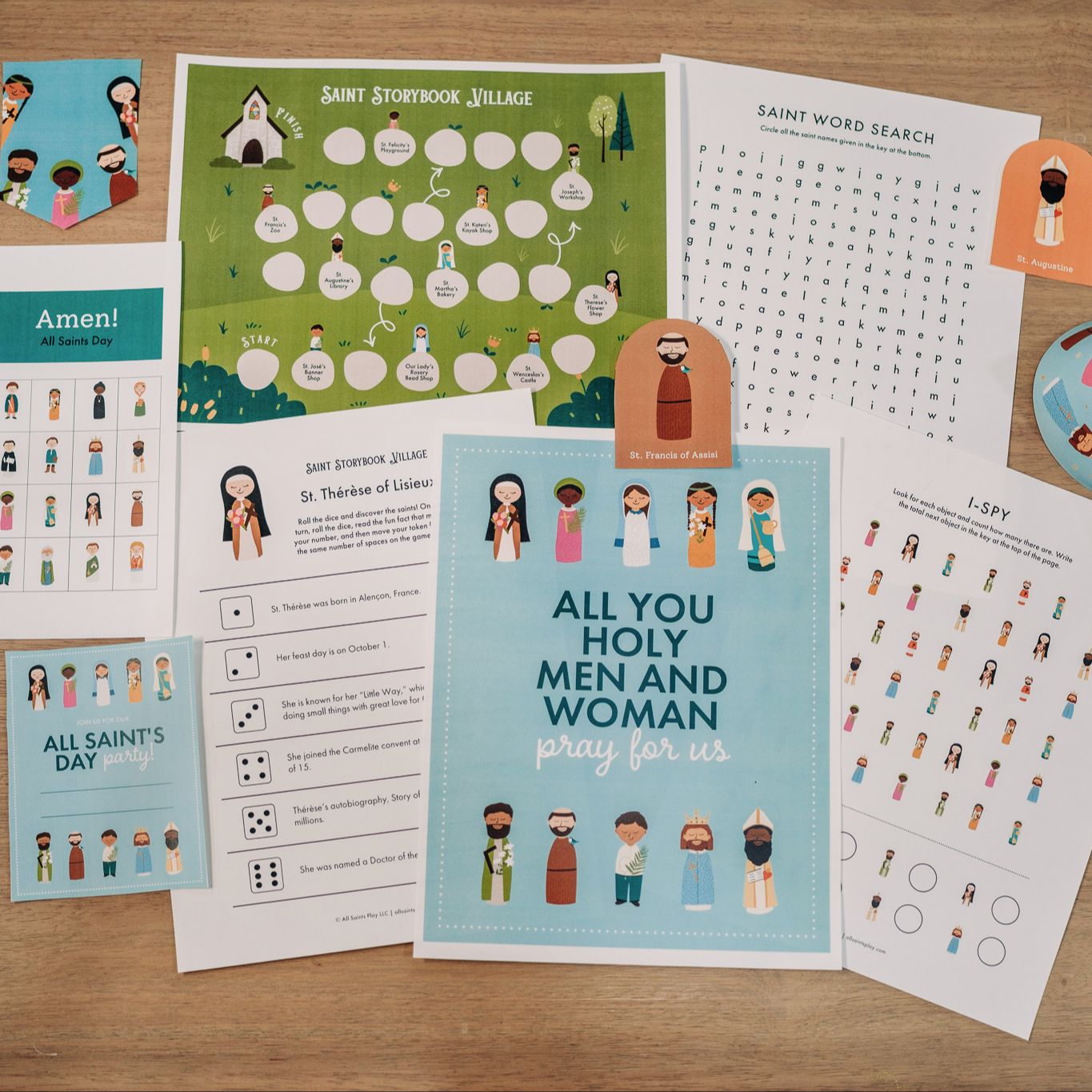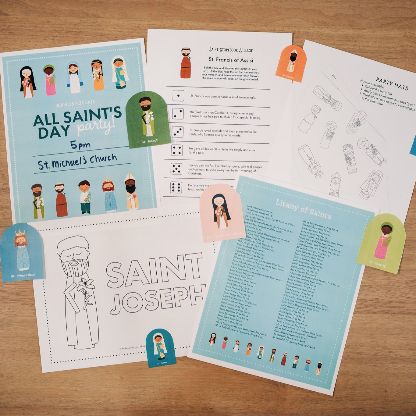 - Multipurpose saint shapes for cupcakes, games, and décor
