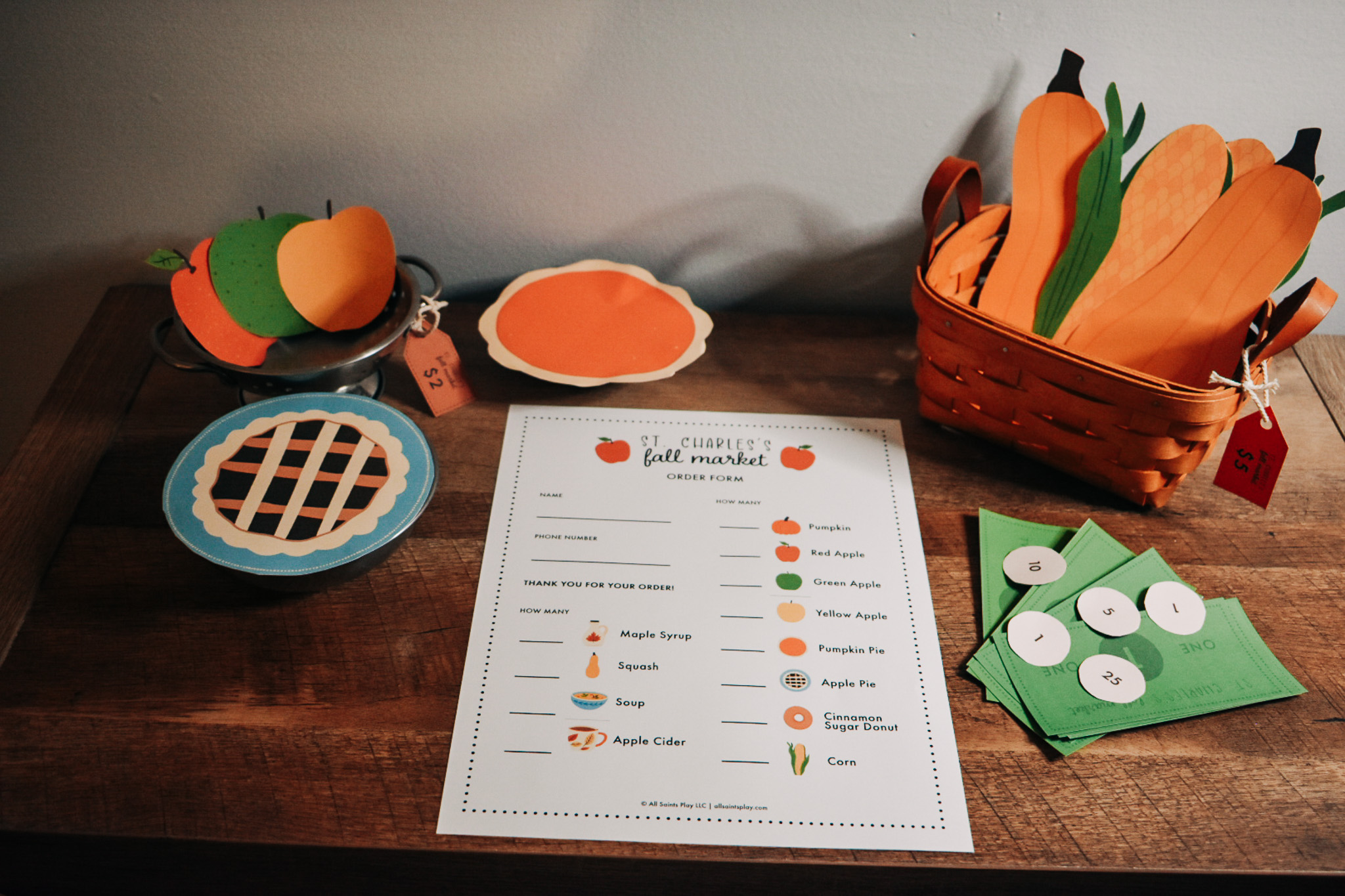 St. Charles’s Fall Market stand, order forms, play money, price tags, banners, and role-play props