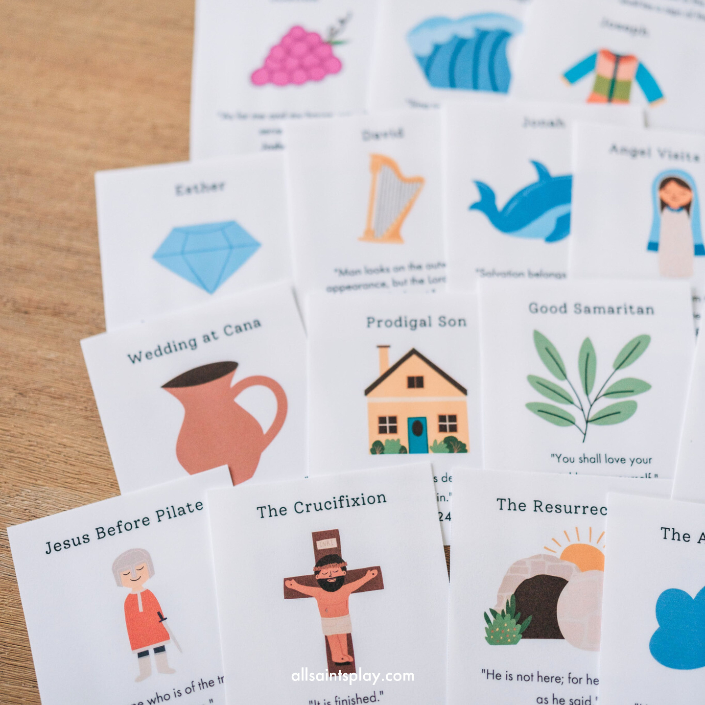 Trusted Verse Translations: Each card features a simple scripture verse taken from the RSV-CE (Revised Standard Version Catholic Edition).