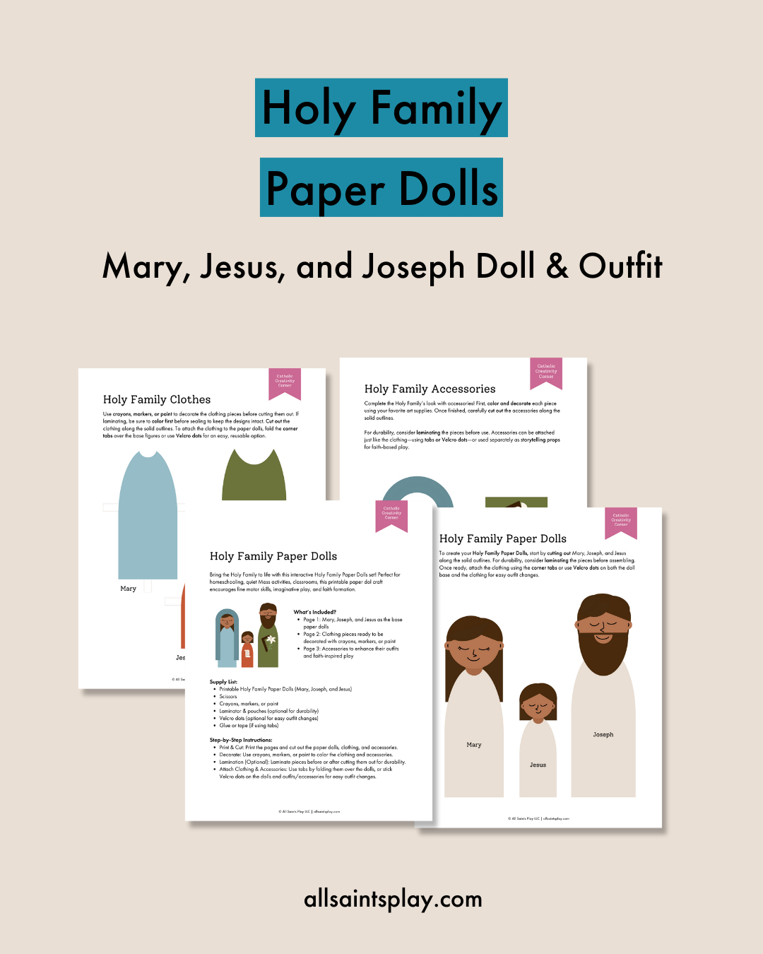 Create and explore the Holy Family with this printable paper doll set! Children can color, cut, and dress Jesus, Mary, and Joseph using tabs or Velcro for easy outfit changes. Perfect for Catholic homeschooling, classrooms, or quiet Mass activities, this hands-on craft encourages fine motor skills, creativity, and faith formation. Simply print, decorate, and play!