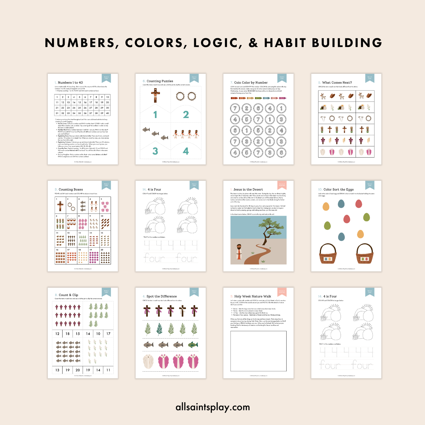 - Math & Logic – Count, sort, and pattern with activities like "1 is One" Count & Color, Number Matching with the 12 Disciples, Loaves & Fishes counting, and Coin Color by Number.