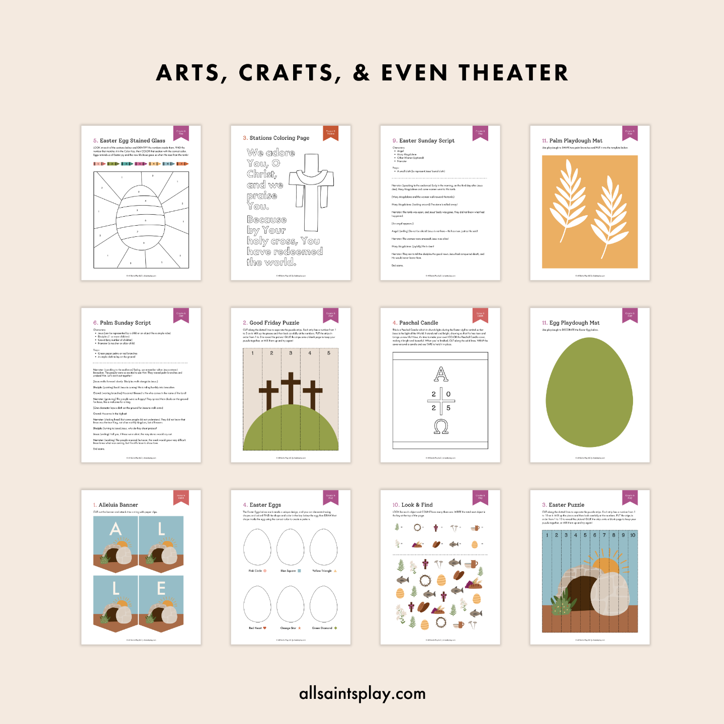 - Create & Play – Hands-on crafts and dramatic play, including a Resurrection Garden, Easter Egg Stained Glass craft, Palm Branch Weaving, and Holy Week Play Scripts to bring the Passion story to life.