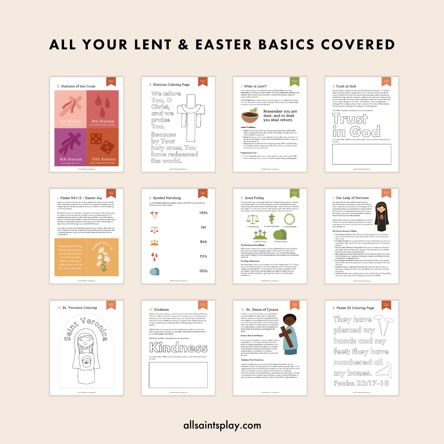 - Saints & Virtues – Learn about St. Peter’s repentance, St. Veronica’s compassion, St. Simon of Cyrene’s kindness, St. Mary Magdalene’s faith, and more, through coloring, matching, and reflection activities.