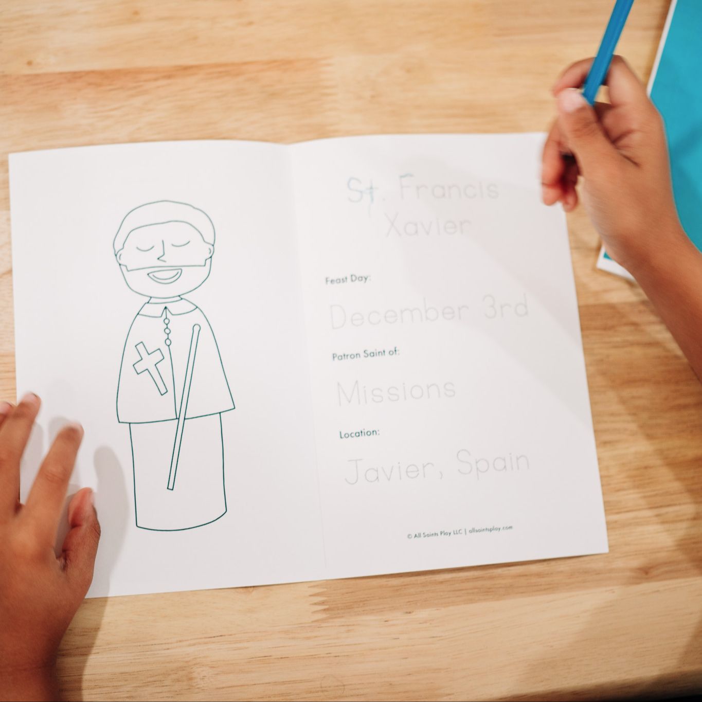 - Inside the booklet includes coloring page, saint name, patronage, and location