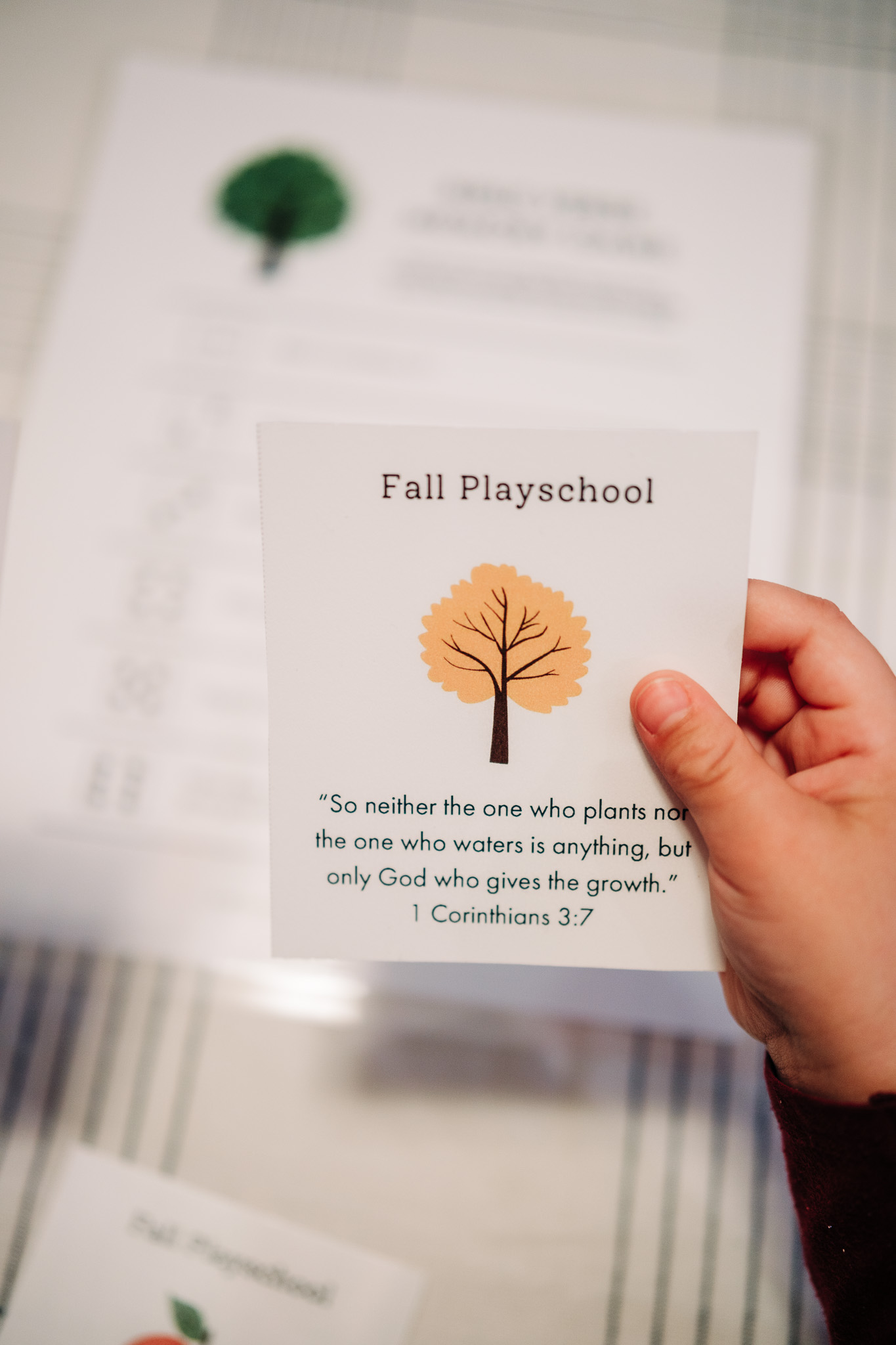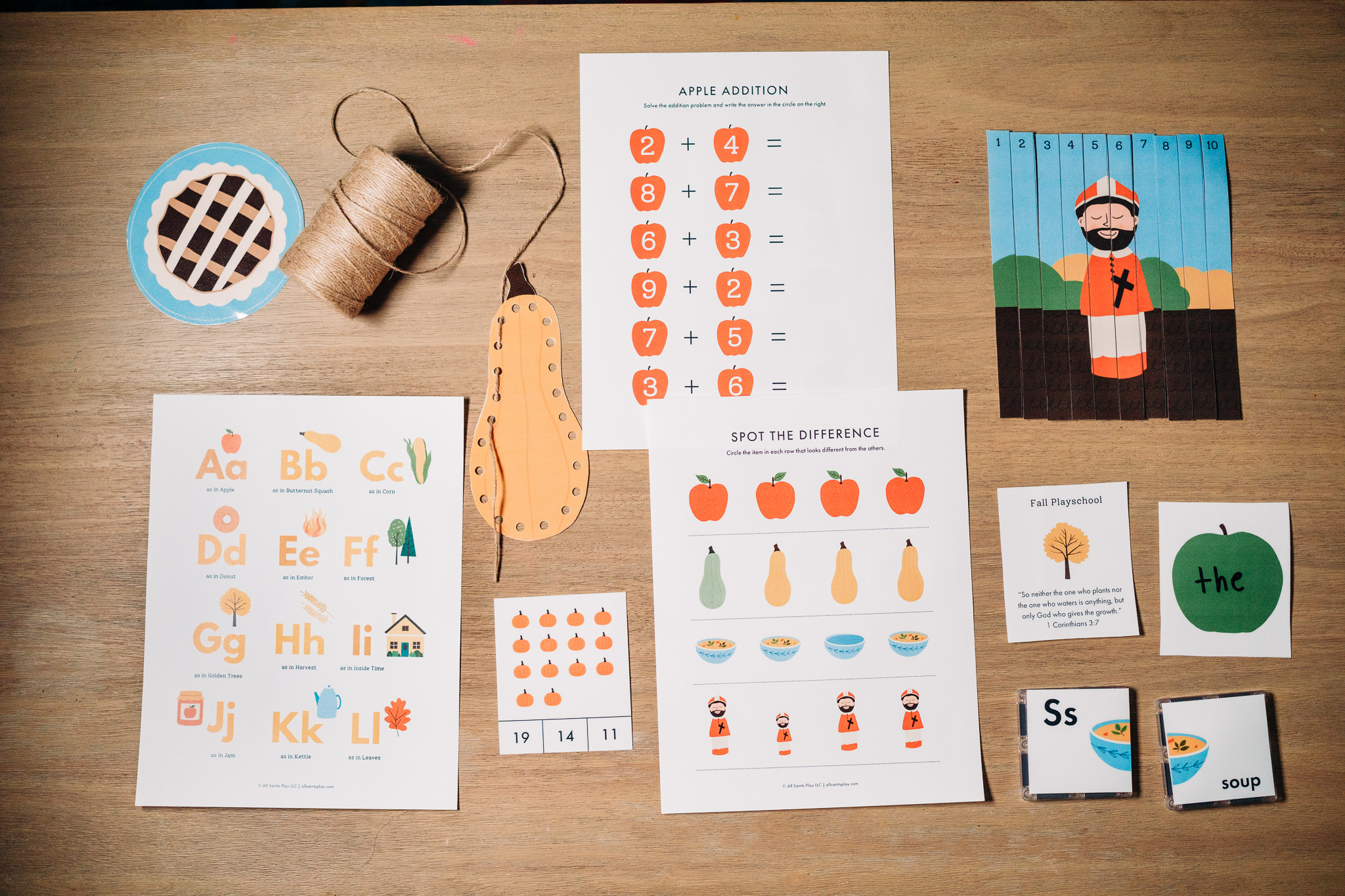 • Creative play & sensory ideas: pie making, soup station, apple seed dig, orchard obstacle course, leaf color and cut, shadow match, and spot the difference